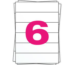 Per ogni foglio ci sono 6 etichette in formato A4. Queste etichette in formato A4 sono composte da 70gr di carta bianca. Il supporto è di 55gr. Le etichette in formato A4 hanno un forte adesivo permanente.